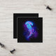 Água-viva grande, azul, desenhada artisticamente, brilhante, brilhante, com longos tentáculos sobre fundo preto com bioluminescência roxa. Água-viva luminosa.