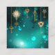 Chaves Douradas e antigas com engrenagens e marcadores penduram em correntes douradas sobre fundo verde luminoso.