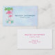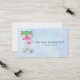 Cartões de visitas com ilustração de um flamingo cor-de-rosa-mamã e bebê parados num leito de flores florais suculentas com palmeiras verdes balançando nas costas. Tropical e bonito. O fundo é azul claro.