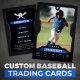 Este modelo de cartão de baseball moderno e elegante é perfeito para mostrar as estatísticas e realizações de seu jogador favorito. Com seu esquema de cores preto e azul, ele certamente se destaca da multidão. Personalize-o com o nome, a imagem e as estatísticas do seu jogador para criar um cartão verdadeiramente único e memorável. Isto faz um presente de excelente para qualquer fã ou jogador de beisebol.
