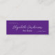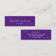 Este mini cartão de visita roxo e branco real tem uma linha de escrita manual branca para o seu nome na frente. O texto adicional para o seu título está disponível abaixo do script. A parte traseira também tem quatro linhas de texto de exibição para seu nome de salão, endereço e número de telefone. Todo o texto pode ser editado ou excluído.