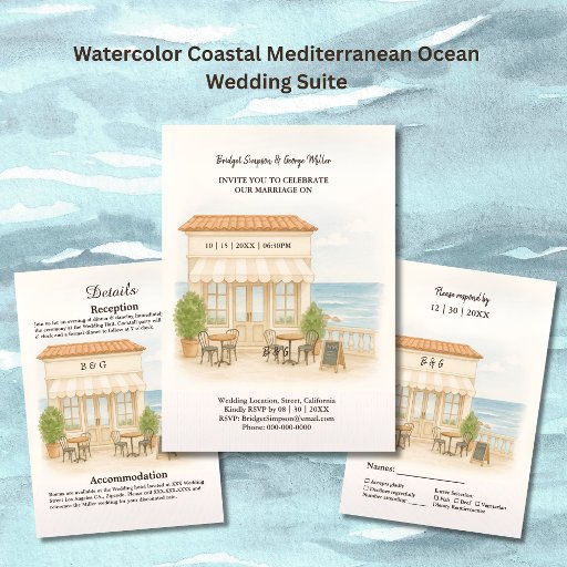 carta de convidado do solteiro de casamento costeiro mediterrânico da costa da água Este design ilustra lindamente uma cena romântica de casamento costeiro em frente a um café inspirado no Mediterrâneo pelo mar. Com seu telhado de terracota, assados, cadeiras de ferro rústicas, e verde cercado, evoca o charme do sul da Europa e a relaxada elegância da vida costeira. Os tons de aquarela macia e o fundo sereno do oceano criam um cenário de sonho e eterno, fazer perfeito para casais planejando um casamento de destino perto da costa. Sua estética quente e convidativa combina a arquitetura rustica do Mediterrâneo com o romance gentil de uma celebração à beira-mar, ideal para casamentos que abraçam elegância e intimidade. Esta trabalho de arte é cuidadosamente criada com a IA e faz parte de uma coleção de casamento personalizável, oferecendo designs correspondentes para uma carta de casamento coesa e decoração. Por meio de links afiliados, esses designs também podem gerar comissão, fazer-os não apenas bonitos mas também gratificantes para compartilhar.
