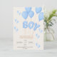 Este convite azul encantador é perfeito para celebrar uma ocasião especial para um menino. Ele apresenta cores azul claro suaves com desenhos divertidos como balões, combinando doçura e elegância. O layout elegante inclui espaço para detalhes pessoais do evento, como data, hora e local. Ideal para aniversários, chás de bebê ou festas de batizado, este convite define o tom perfeito para uma reunião alegre inesquecível.