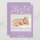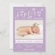 Cartão com fotos de convite batismo com caligrafia elegante e design de folhagem em cor roxa. Fácil de personalizar com seu próprio texto.