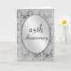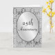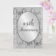 Cartão de aniversário de prata de 25 anos, convite ou anúncio com belo padrão damasco em tons de prata correspondentes. O texto "Aniversário de 25 anos" está na capa em uma moldura oval prateada correspondente. Adicione suas próprias palavras pessoais no interior ou deixe em branco para escrever à mão mais tarde. Fácil de alterar o texto para casamentos, aniversários e cartões de outras ocasiões especiais. Um cartão elegante e pessoal adorável.