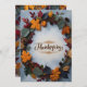 Capture a essência do outono com este delicado cartão de convite para Ação de Graças, com uma coroa vibrante de folhas coloridas, pinecones e bagas colocadas sobre um fundo azul macio. Perfeito por convidar os entes queridos para suas celebrações do outono, este cartão incorpora calor e elegância, fazer ideal para jantas de Ação de Graças, reuniões sazonais e eventos festivos.