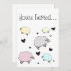 Um convite com um coração negro giro e design de ovelha pastel polkadot.