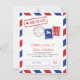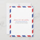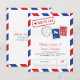 Cartão Save the Date Inspirado no Correio Aéreo em Vermelho Brilhante e Azul Real. Marca de Selo Falso e Marcações de Postagem para um Casamento com Tema de Viagem.