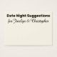 Aqui está um acessório divertido para pegar sua festa de noivado ou chá: cartões de sugestão noturnos de data nos quais os convidados podem escrever notas pessoais para a noiva e o noivo. Na frente, você lê "Sugestões da Noite de Data" em uma fonte ousada, sans-serif; esta fonte é editável para que você possa escolher outra, se preferir... ou até escrever uma mensagem diferente. Abaixo há um lugar para seus nomes; eles aparecem em um roteiro bonito que também é fácil de mudar. Altere o fundo para qualquer cor que você preferir!. Por favor, não hesite em contactar-me se tiver pedidos especiais ou necessitar de outros pontos. Também me apraz ajudar na personalização destes cartões, se for necessário. //