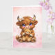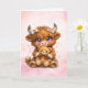 Envie um pouco de calor e doçura com este adorável cartão de saudação de vaca das Terras Altas. Com uma bebê vaca das Terras Altas fofa e fofinha abraçando um ursinho de pelúcia, esta ilustração calorosa é rodeada por um fundo de aquarela rosa sonhador repleto de brilhos suaves e pétalas delicadas.