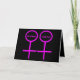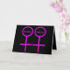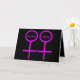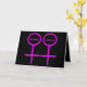 Este cartão de cumprimentos elegante é projetado para lésbicas. Ele apresenta dois símbolos femininos cor-de-rosa lado a lado. O fundo é preto e há texto cor-de-rosa personalizável dentro de cada um dos símbolos para colocar nomes. Este cartão é ótimo para enviar a um casal lésbico no Dia dos Namorados ou no dia do casamento. O interior do cartão é preto com texto cor-de-rosa totalmente personalizável. Você pode digitar o que quiser e torná-lo verdadeiramente pessoal.