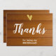 Elegante cartão de agradecimento de casamento com coração em folha de ouro falso em escrita branca chic. A frente e o verso do cartão são em madeira de celeiro falsa.