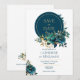 Este cartão de data de salvamento de casamento apresenta flores turquesa em aquarela e detalhes em dourado, dando-lhe um charme romântico. As fontes serifadas e script elegantes tornam este design perfeito para casamentos clássicos. Também é adequado para casamentos rústicos, vintage e boho.