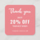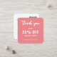 Um cartão de desconto rosa, branco e preto minimalista com código QR para uma empresa profissional usar como ferramenta de promocional para desenvolver a fidelidade do cliente. Você pode alterar a fonte, a cor da fonte, o tamanho da fonte, o espaçamento da letra, a cor do plano de fundo e a cor do gráfico Obrigado usando a Ferramenta Design. Você também pode mudar os ícones das mídias sociais para que eles sejam relevantes para a sua empresa. O simples design elegante moderno é seu para personalizar como quiser.
