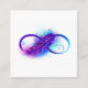 Símbolo infinito com uma bela pena pintada em cores roxas e azuis brilhantes sobre fundo branco.