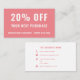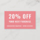 Um cartão de desconto branco e cor-de-rosa minimalista para uma empresa profissional usar como ferramenta de promocional para desenvolver a fidelidade do cliente. Você pode alterar a fonte, a cor da fonte, o tamanho da fonte, o espaçamento da letra e a cor do plano de fundo usando a Ferramenta Design. O texto da tipografia é personalizável. Você pode mudar as palavras. Por exemplo, o CÓDIGO DE DESCONTO pode ser alterado para CÓDIGO DE PROMO. O simples design elegante moderno é seu para personalizar como quiser.