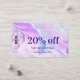 Uma tendência holográfica em cor rosa, roxo, azul. Na frente: adicione desconto. Voltar: Personalize e adicione seu nome comercial, endereço, número de telefone, email, endereço do site, código qr ao site ou conta de mídia social.