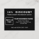 Atrair mais clientes. Convença mais clientes a comprar de seus produtos ou a gostar de seus serviços, oferecendo desconto. Anuncie também sua empresa, promova seu nome de marca ou crie reconhecimento de nome de marca. Personalize este cartão de desconto especificando o desconto em porcentagem que você oferecerá, a data de validade, o upload do logotipo de sua empresa, digitando o nome da sua empresa ou empresa, endereço e número de telefone. O design da placa de desconto é uma fonte simples e branca sobre fundo preto. Verifique a aparência após carregar o logotipo e digitar textos. Se a aparência lhe agrada, você pode colocar seu pedido agora. Se você precisar redimensionar e mover o logotipo e os textos para o ajustado neste cartão de desconto ou em outras formas e tamanhos que você escolher, mude na ferramenta design. Você também pode fazer outras alterações de acordo com sua preferência na ferramenta design, como alterar a cor do cartão de desconto, a cor da fonte, o estilo da fonte, editar textos, adicionar textos e excluir textos.