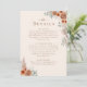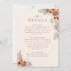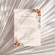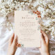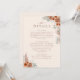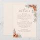 Compartilhe todas as informações importantes que seus convidados precisam com este cartão de detalhes de casamento boho elegante, projetado para complementar seu tema de casamento rústico e terroso. Ele apresenta um suave buquê de flores terracota e bege, grama pampas, folhas de palmeira secas e folhagem de eucalipto sutil em um fundo bege quente.