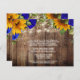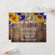 Cartão de Detalhes de Casamento Rústico com Girassóis e Rosas Azuis. Um ótimo cartão onde você pode adicionar informações extras sobre o seu evento. Apresenta girassóis amarelos com rosas azuis-marinho e baby's breath branca sobre um fundo de madeira rústica. Luzes cintilantes pendem do topo com um coração.