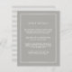 Elegante e simples, esta pequena carta em cinza Greige-beige permite que você compartilhe detalhes chave com seus convidados de casamento. Projetado para combinar com nossa coleção de casamento de Eternos, as cartas apresentam uma borda geométrica branca e uma letra de serifa clássica. Que informações incluir em um convite de casamento? Considere detalhes como acomodações de hotel, códigos de grupo, transporte, instruções, informações de recepção de boas-vindas e sua URL do site de casamento. Você pode até fazer upload de um mapa para o lado inverso usando a função Personalizar.