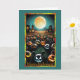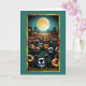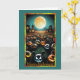 Este cartão de Dia das Bruxas apresenta uma cena assustadora e festiva sob uma lua de cheio brilhante. No primeiro plano, uma reunião de abóboras entalhadas, cada uma com uma face única e estranha, parece ganhar vida. As abóboras têm expressões animadas, que vão de resinas maliciosas a olhares sinistros, acrescentando uma atmosfera lúdica e assustadora. O fundo mostra uma paisagem assombrosa com silhuetas escuras de árvores e casas antigas e misteriosas com janelas brilhantes, somando ao ambiente estranho da noite.