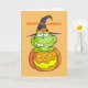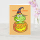 Aqui está um cartão de Dia das Bruxas "não-assustador" divertido! Ele apresenta um sapo de desenho verde bonito vestido com um chapéu de bruxa aparecendo de um jack-o-lanterno, tudo em um fundo laranja mais leve. O texto do lado de fora diz "Feliz Dia das Bruxas!", e no dentro "É Halloween! Divirta-se." Todo o texto é totalmente personalizável, então você pode facilmente fazê-lo dizer o que quiser.