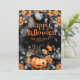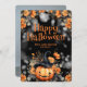 Cartão de Dia das Bruxas com uma lanterna-jack vestindo um chapéu preto e enfeitado com flores laranja na frente e uma foto na parte de trás. Personalize facilmente este belo cartão de Dia das Bruxas com sua foto e o nome da família.