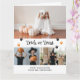 Feliz cartão de Halloween com uma colagem fotográfica com estampas na frente, um fantasma esquelético com um dentro de jack-o-lanterno, e uma abóbora vestindo um chapéu de bruxa preta e adornada com flores laranja na parte de trás. Personalize facilmente este cartão de Dia das Bruxas fofo com o seu nome e texto da família.