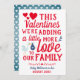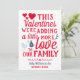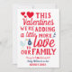 O cartão de Dia de os namorados do anúncio de gravidez personalizado com um gênero revela para surpreender sua família e amigos e avisá-los quando seu bebê nascer. Design em cores vermelhas, azuis e brancas com coração.
