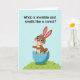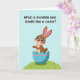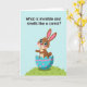 Este cartão de saudação mostra um coelho fofo e humanizado com pelo castanho quente, orelhas internas rosadas e grandes olhos azuis que parecem olhar para cima com um olhar amigável e convidativo 🐰. Um rubor rosa suave está em suas bochechas, e algumas manchas castanhas mais escuras adicionam detalhes em todo o seu corpo enquanto ele espreita de um ovo rachado. A casca do ovo é turquesa com faixas onduladas rosadas e pontos rosados espalhados, dando-lhe um visual festivo e doce que parece ser compartilhado entre amigos próximos. O coelho repousa sobre uma colina verde suavemente ondulada com algumas pinceladas simples de grama, colocado contra um amplo fundo azul-celeste que mantém a cena arejada e calma 🌷. Perto do topo, uma linha de texto preto sem serifa pergunta: “O que é invisível e cheira a cenoura?” centralizado e fácil de ler. A postura ereta do coelho e a cabeça ligeiramente inclinada adicionam uma energia terna e curiosa, como se estivesse esperando