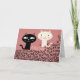 GATOS PRETOS E BRANCOS OLHANDO UM PARA O OUTRO, O CARTÃO TEM FUNDO ROSA E ESCREVE AMOR POR TODO O LUGAR, E TAMBÉM MIA ALGUMAS VEZES. DENTRO DELE ESCREVE "AMOR À PRIMEIRA MIADA"