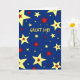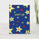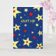 Feliz cartão de saudação de dia dos profissionais administrativos em azul, amarelo e vermelho com padrão de estrelas divertidas. Lembre ao seu funcionarios o valor que eles têm com este construtor moral excelente.