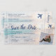 Cartão de Passagem Aérea de Embarque com Destino de Casamento na Praia Salve o Cartão de Data com um romântico pôr do sol ou nascer do sol em tons de azul teal, verde aqua, pêssego e amarelo sobre a costa arenosa do oceano com águas turquesa. Use a Ferramenta de Design Zazzle para edição avançada do modelo de design, como alterar a cor do texto, fonte e posicionamento, e o fundo do cartão e cor do avião. Entre em contato comigo para itens de coordenação que você está procurando, ou use "transferir este design" para criar o seu próprio em qualquer item Zazzle.