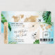 Passagem de embarque para o destino de Casamento na Praia com coração e ícone de avião com folhas tropicais