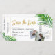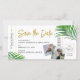 Cartão de Embarque para Casamento na Praia Tropical com Design de Folha de Palmeira Caprichoso Moderno e Fonte de Letra Tendência apresenta toneladas de campos de modelo personalizáveis, fotos, informações de viagem e gerador de código qr personalizado no verso do cartão.