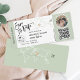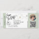 Passagem de Embarque para Casamento na Praia Destino Bilhete de Save the Date Dourado com ícone de coração e avião com mapa mundial de arte de linha minimalista simples e cor de fundo verde musgo. Adicione seu código QR