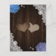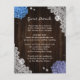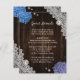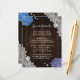 Forneça aos seus convidados detalhes importantes com este cartão de enclausuramento de casamento floral roxo e azul rústico, apresentando flores de hortênsia azuis e roxas em um fundo de madeira de celeiro adornado com renda floral branca.