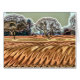 Um desenho abstrato e divertido de campos e árvores arados (arados) ao fundo, uma típica paisagem rural.