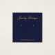 Um simples cartão de exposição de brinco azul marinho e dourado: apenas texto dourado sobre fundo azul marinho. O nome é escrito em uma caligrafia elegante, abaixo dele, os lugares dos brincos são indicados por dois círculos muito pequenos. O site é escrito perto da borda inferior.