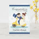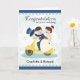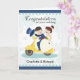 Casal de casamento andando de scooter, com flores azuis ao fundo, cores azuis duelos um cartão bonito com apelo atemporal, personalize com seus próprios nomes