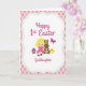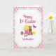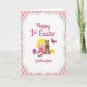O desenho da frente mostra uma jovem menina loira em um vestido magenta sentada com um sorriso gentil, sua postura ligeiramente voltada para um coelho marrom amigável de orelhas compridas 🐰 e um passarinho amarelo minúsculo, como se estivessem compartilhando um momento tranquilo juntos. Um ovo oval listrado em magenta e azul-turquesa repousa ao seu lado, adicionando um toque festivo à cena. Acima deles, um inseto de asas vermelhas paira, trazendo um pouco de movimento à paleta suave. A ilustração está dentro de uma ampla área de espaço branco cremoso, emoldurada por uma borda rendilhada com detalhes pontilhados minúsculos. Fora da moldura, o fundo é preenchido com diamantes rosa e bege suaves dispostos como uma leve tela xadrez. No topo, uma saudação sazonal aparece em letras magenta em laço, enquanto uma linha de dedicatória mais curta na mesma cor magenta está ao longo da