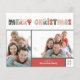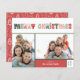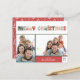 O cartão com fotos de Natal com orçamento colorido para as famílias mostra duas das suas melhores fotos de família, acentuadas pelo "Feliz Natal" em letras quentes e multicoloridas. Personalize com seu nome e o ano. As cartas se invertem a um padrão de árvore de Natal divertido em um fundo vermelho.