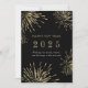 Cartão de cartões de natal de Ano Novo Elegante, de dois lados, com fogos de artifício dourados em fundo preto. Apresenta o ‘Feliz ano novo 2025’ e uma mensagem festiva na frente, além de uma foto personalizável e o nome da família no verso. Perfeito para um cartão com fotos de luxo personalizado.