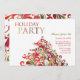 Um convite animado, colorido, de festas de férias com espirros em tons de vermelho e verde contra um fundo branco.