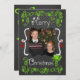 Um quadro de discussão tem um plano de fundo com belos pergaminhos de verde com estrelas vermelhas e texto branco que diz "Feliz Natal" na frente e "Que todos os seus dias sejam felizes e brilhantes" na parte de trás. Este belo Cartões de foto de Natal de feriado personalizado tem vários ornamentos de estrelas, e um pássaro em um design de ninho e áreas que você pode adicionar facilmente seus nomes, o ano atual e a foto!