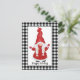 O cartão de feriado personalizável bonito apresenta o gnomo da menina do estilo tomate com longos bróides brancos, vestidos em Papai noel vermelho, com borda de xadrez de búfalo preto e branco. Personalize com sua própria saudação ou deixe "Felizes Feriados" como está.
