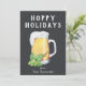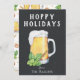 Caneca de cerveja pintada, lúpulo e trigo em quadro-negro com padrão de pub correspondente no verso, cartão engraçado de "Férias Hoppy".