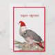 Lindo Papagaio Cinzento Africano do Congo com um chapéu de Papai Noel segurando um bastão de doce em um cartão de férias chapado. Perfeito para um dono de papagaio!