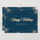 Cartões de férias azuis e dourados elegantes com flocos de neve e neve em um fundo azul. Um título lindo e manuscrito com efeito de folha dourada no centro. Personalize facilmente esses cartões de férias de floco de neve azuis e dourados com o nome da sua família e mensagem. Solicitações personalizadas são bem-vindas.